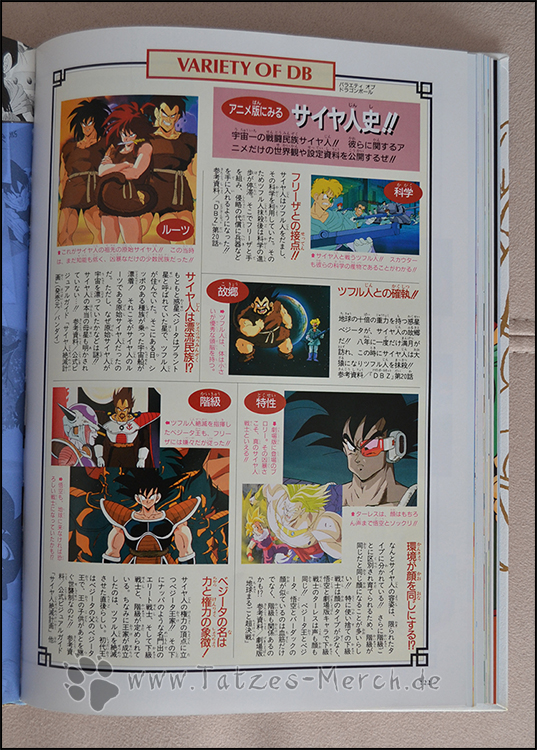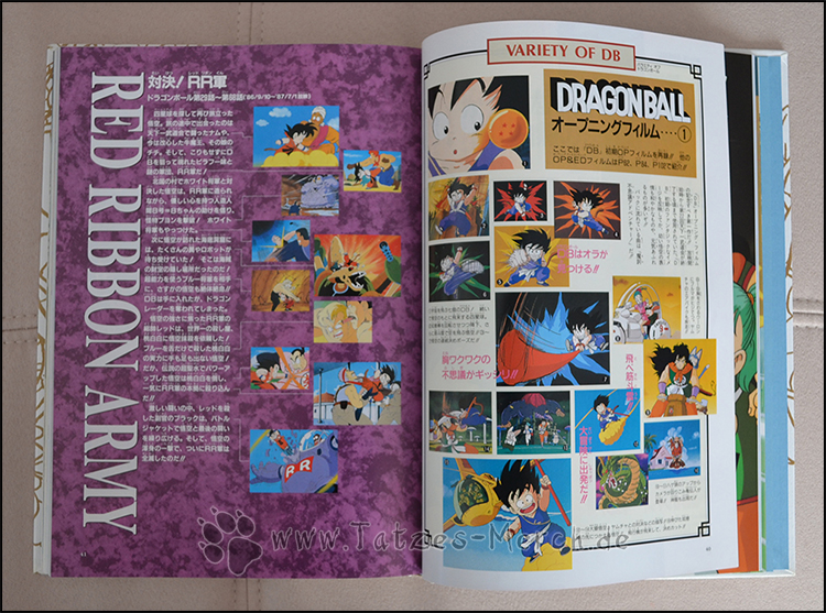 Der erste Part des Artbooks befasst sich mit den Dragon Ball Super Battle Scenes und geht hier auf alle wichtigen Kämpfe noch mal ein. Es wurde weiter unterteilt und in kurze „Arcs“ zusammengefasst – z.B. Son-Gokus erstes großes Turnier, die Kämpfe gegen die Red Ribbon Armee usw. Hier werden auch noch mal genau die Anzahl der jeweiligen Episoden und deren Sendezeitraum angegeben. Dazwischen werden unter dem Titel Variety of DB Bildsequenzen aus den Openings und Endings von Dragon Ball gezeigt und Erklärungen dazu abgegeben.