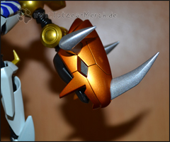 Trotz allem Gemecker über die Positionierfähigkeit der Figur bin ich doch sehr begeistert wie detailliert sie ist – gerade der Oberkörper, der Kopf und den Brave Shield an der Schulter finde ich sehr schön gemacht. Außerdem gefällt mir der Perlmutt-Glanz, den es auf seiner Körperpanzerung hat sehr gut =)