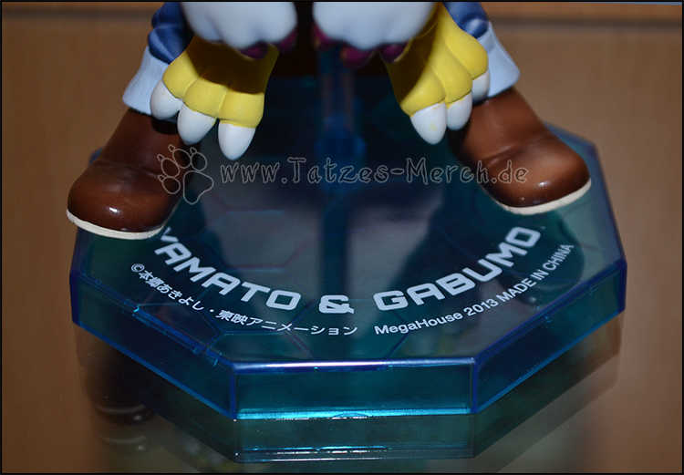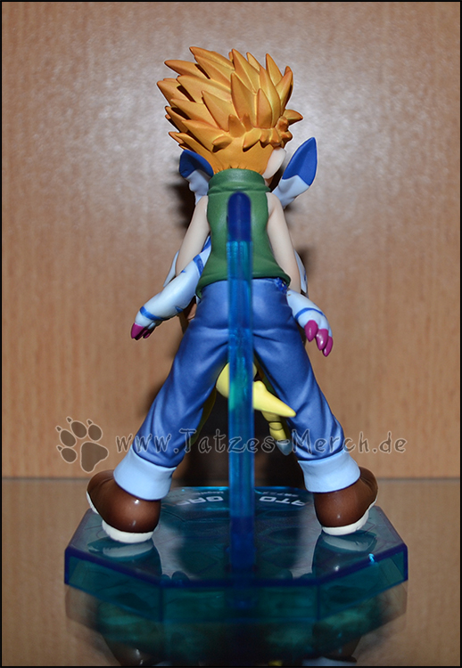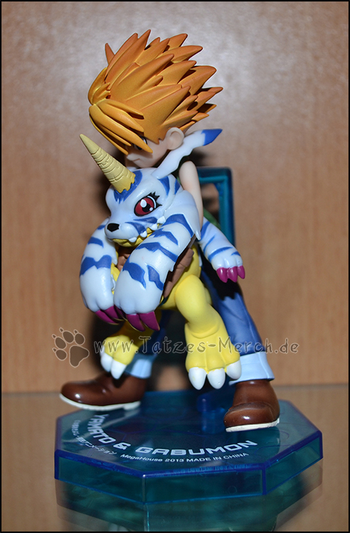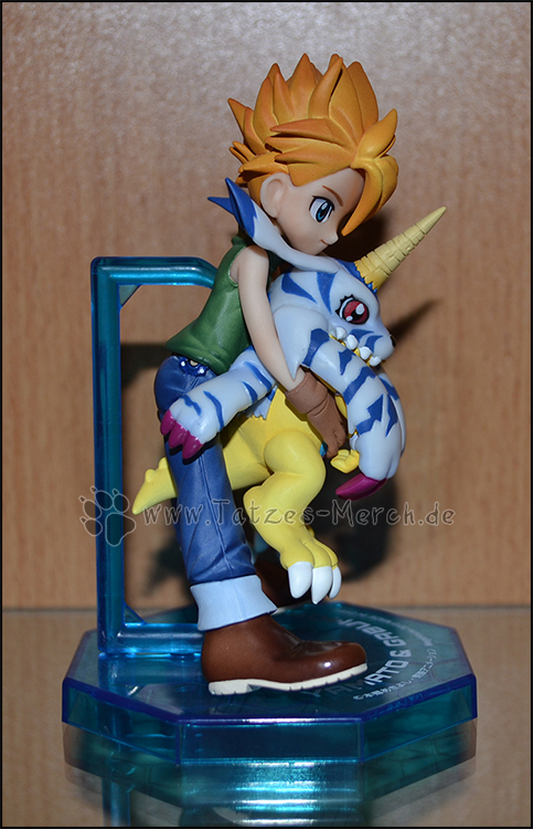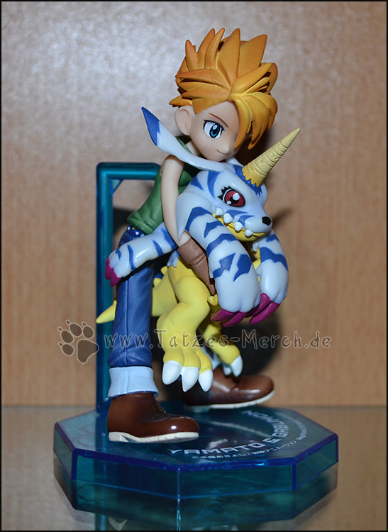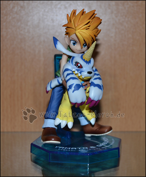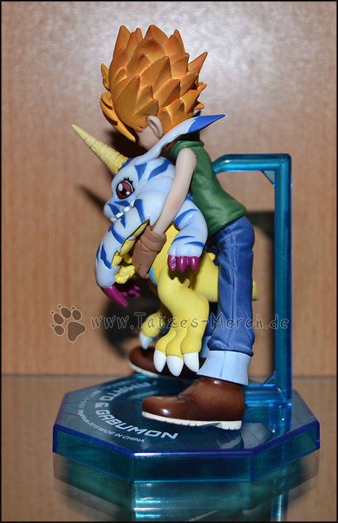 Die Figur ist an einem Dorn in Yamatos Rücken an dem kleinen blau-transparenten Ständer befestigt und schwebt so etwas über der Bodenplatte, auf der die Namen des Jungen und seines Digimon sowie die Herstellerfirma, das Jahr usw. stehen.